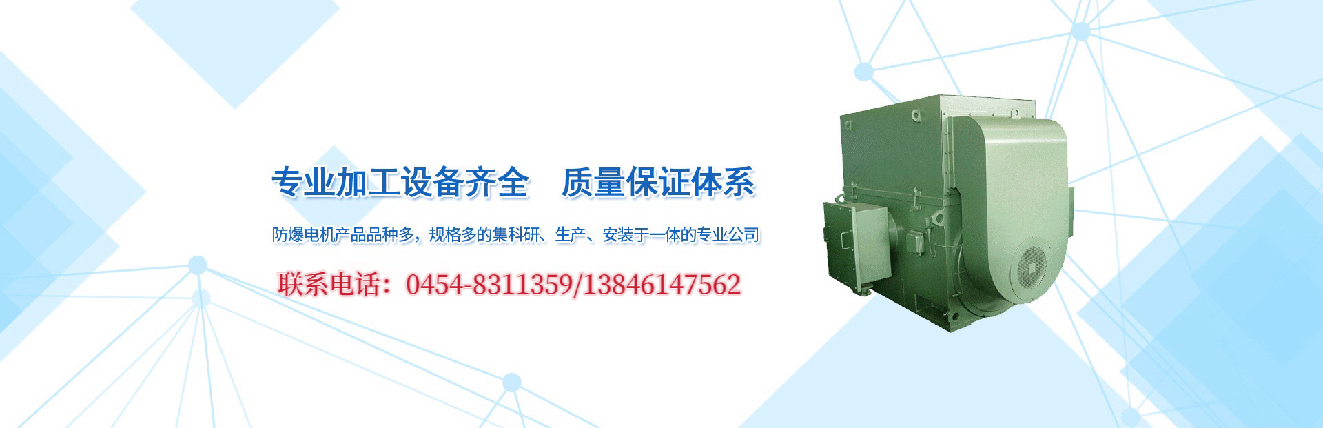 佳木斯防爆電機有限公司是集科研、制造、銷售及售后服務一體的防爆電機、防爆電器制造公司。公司位于佳木斯市東風區建國街418號,占地面積43000平方米,現有員工386人,其中工程技術人員62人,擁有各類加工、檢驗設備570余臺套。
